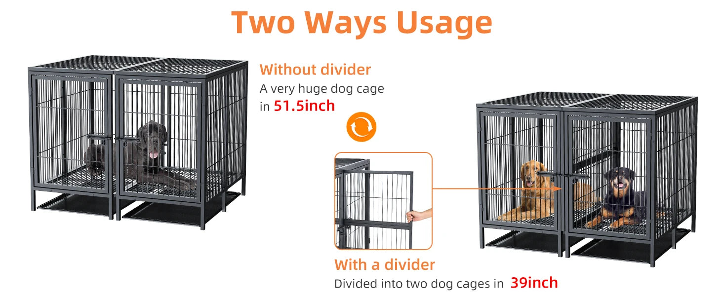 - Removable divider panel splits the interior into two 39-inch spaces for two dogs (up to 40 kg each) or, when removed, forms a single oversized enclosure about 51.5 inches long with an 84 cm interior height.